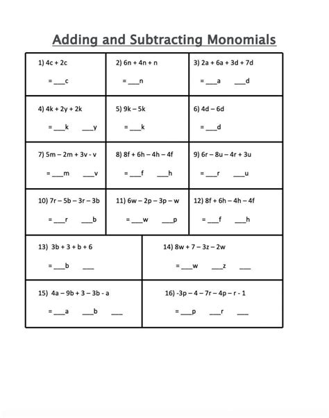 This adding and subtracting monomials with a degree of 1 lesson and activity set is just what you need for teaching, engaging and. Web adding and subtracting monomials worksheets is a helpful resource for students trying to learn adding and subtracting monomials. This monomials worksheet is a good resource for students in the 5th grade, 6th grade, 7th grade, and.