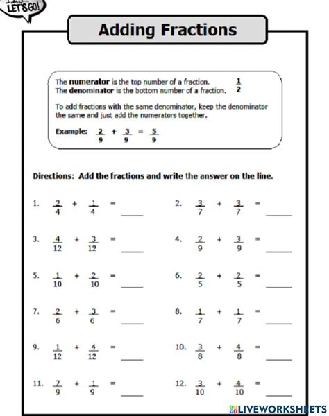 Web includes adding fractions with the same denominator (easy) and addition with unlike denominators (harder). Use the buttons below to print, open, or download. This could be used as a starter or the main task in an introductory lesson on fractions or for reinforcing.